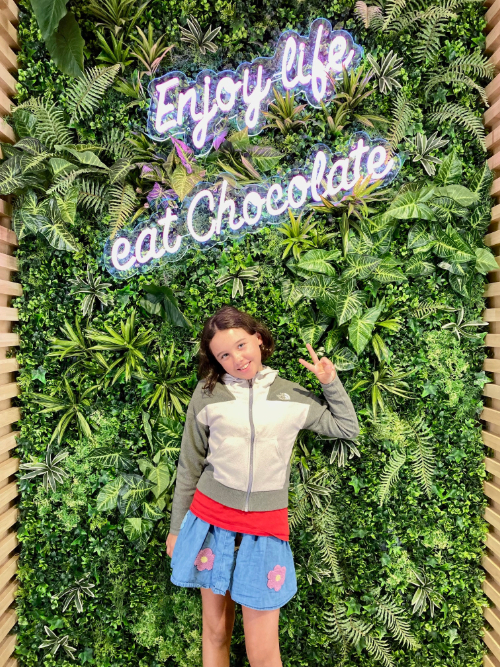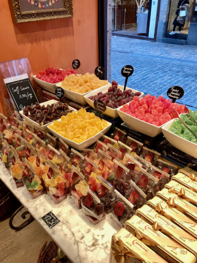 After that hearty lunch, we wandered the cobblestones and poked into various shops, including one that sold delicious chocolates (me), one with massive pink meringues (Grace), and one with cotton candy (Kieran). Sean treated himself to some gum, lol. After which we spotted a Claire’s Accessories and, on a bit of a whim, allowed Grace to get her ears pierced. I warned her that her first earrings would probably just be plain gold or silver balls – that’s what was available when I got my ears pierced (or so I was told…) – but she was handed a booklet chock-full of choices and once she saw the tiny Hello Kitty studs, there was no talking her out of them, even though they were an extra cost; eye roll. In the end, after a near-faint, she was all good and I had to admit, the Hello Kitties were adorable on her.