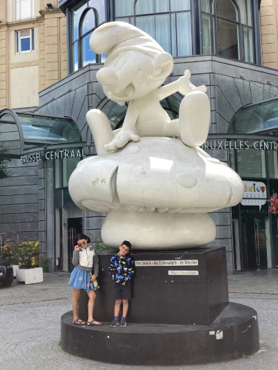 On our last day in Brussels, we of course had to start the day off right with traditional Belgian waffles at Maison Dandoy (topped with strawberries and whipped cream – yum). We took the obligatory photos with the giant smurf statue out front of the Comic Museum and enjoyed the sights of central Brussels before walking to Wolf Food Market for lunch. We capped the day off at a cat café, and then happened upon a fun street party on the way home where we mingled with the locals, enjoyed some beer and wine, sampled street food from vendor trucks, and watched Kieran challenge the local kids to a ruthless Beyblade battle. A great day, to cap off a great (but short) stay in Brussels.