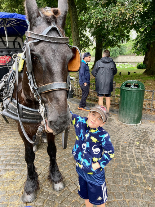 I wish I could say our day in Bruges was as lovely! We woke up to a drizzly rain on the day we had planned to go, and decided to head off anyway (please note, we don’t have any proper rain gear with us on this trip). We caught an early train (is 9:30 AM early? It seemed like it for us…), arrived in a still-rainy Bruges, and followed a small crowd from the station to the centre. Bruges seemed teeny-tiny compared to Ghent and was pretty touristy. Our first stop was the Cathedral which was massive and FULL of a very impressive collection of altarpieces. We probably lingered in there for longer than we may have, had the weather been nicer. After the cathedral, we walked to the central square where the kids begged us to get a horse carriage tour. We relented to the ridiculous price because the carriages were covered, and it would get us out of the rain for 30 minutes. The tour took us around central Bruges to see various historical streets and buildings, the ‘kissing bridge’, and the town’s famous swans. Grace’s loyalty to cats was (nearly) misplaced for the half hour as she fell in love with our trusty carriage horse. And then we were back in the main square and scurrying through the now-heavier rain to a little Belgian restaurant wher