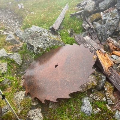 The hut and outhouse at the top look like something from the Matterhorn ride at Disneyland. We clambered to the sign and historical antique-y rusted paraphernalia at the actual summit for the triumphant photo op. Huddled in the hut for snacks and to write postcards to future selves which will be delivered in about a year – such a great idea. We didn’t stay long at the top, due to chill and fog.