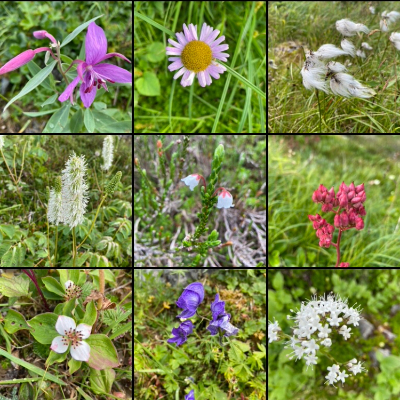 Got on the trail at 9 AM-ish with a clean shirt (!!) and a lighter pack, thanks to leaving tents, air mattresses, toiletries and extra food behind at camp. The day’s hike began in a cold, wet, foggy drizzle but nothing could dampen the beauty of the wildflowers, snowy peaks, rushing streams, and rocky slopes. So many gorgeous types of flowers I want to look up when we’re back in civilization. Sean was representing AirCanada hard with his homemade pack cover – must tag them in a photo!