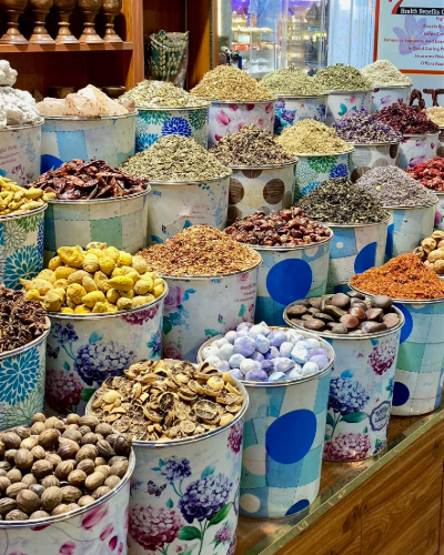 Later that day we had booked a souk tour in the older town part of Dubai. We walked the 30-ish minutes to the meeting point which was relentlessly hot, there not being much shade on the route. So of course, I was worrying about heat stroke the rest of the day (what’s new) but all was well. The tour itself was really interesting; we learned about tea hospitality, the Emirates government system, and how Arab people lived in the desert through different seasons previous to modern buildings. We drank deliciously cool mango and watermelon juice and boated across the river to the spice souk (of which I took far too many photos). At the end of the tour, we were too tired to go out for dinner, so we made our way back to the apartment and Sean picked up some snacks and wine for us while I blogged.