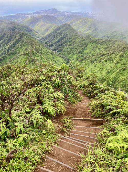 - A wild trek up the Wiliwilinui Ridge Trail – a rambling trail that led up and up until it was a tiny goat track meandering around crags and studded with stairs hammered into the clay. Luckily we chose a dry day to go up – the clay ‘slide’ near the beginning would have been much more treacherous if slippery! We got to the top just as thick white clouds rolled in and literally surrounded us; we could not even see four feet down the back side of the peak. Such an astonishingly breathtaking hike.