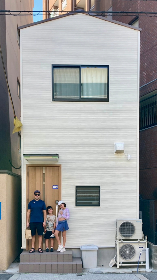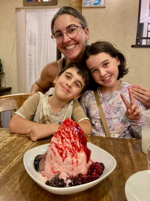 Dinner was an array of yakitori skewers from a small restaurant near us called Aida. Everything was delicious – I don’t think I’ve ever had beef so tasty nor shishitos so spicy! The staff loved the kids and everyone in the place, including the other patrons, cheerfully bade us goodbye when we left. The kids are loving Japan so far and we’re impressed with the foods they’re trying, the Japanese words they’re using, and their grit dealing with the jet lag and the heat.