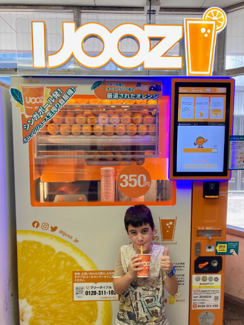 Next day started with a lazy morning, coffee and tea and scrambled eggs on toast (and my trusty granola with yogurt). We got ready for the day, picked up an i-Jooz (freshly-squeezed OJ vending machine… so, so good) at the train station, and had a quick park play before heading to our first destination. It was at the park where we saw the first of many city workers wearing puffed out nylon jackets – turns out they have little fans in them to keep people cool as they work.