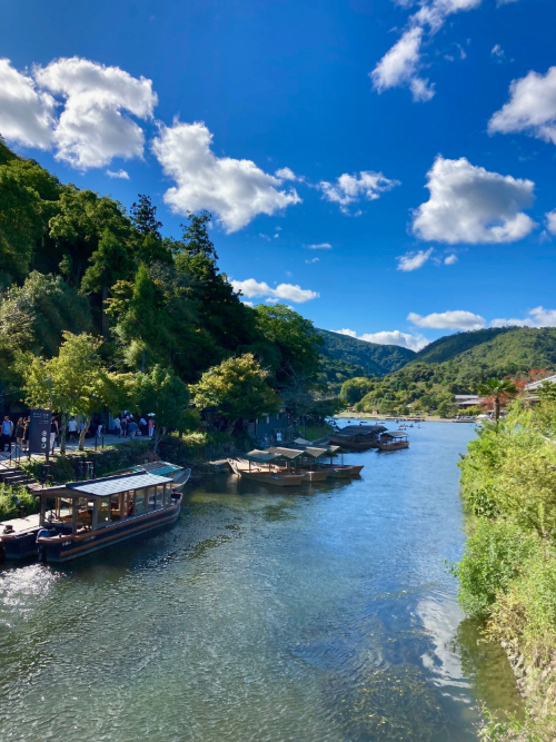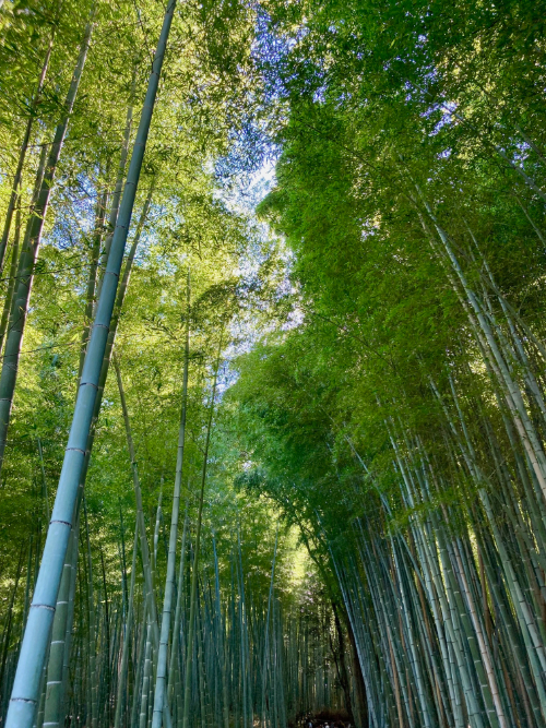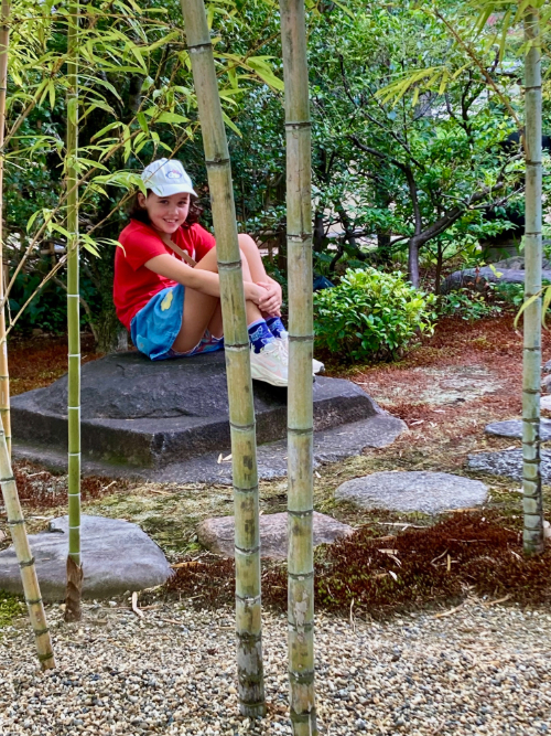 Monday dawned much cooler, thank goodness, for our day in Arashiyama. Alighting from the train at Saga-Arashiyama station, we followed the hordes down narrow streets past street vendors selling all manner of treats: chestnut mont-blancs, sugared strawberries on a skewer, grape ice, yuzu-nade, and earl grey and berry slushies were just a few of the mouth-watering offerings we saw. We walked around the beautiful calm mossiness (it’s a word in my world) of the garden at the Tenryu-ji Zen Buddhist temple – winding pebble paths, huge azalea and hibiscus bushes, a gorgeous pond reflecting the black and white temple structure, and many people in full kimono dress. From that dreamy place, we stepped into the famous Arashiyama Bamboo Forest. It was also dreamy with its huge stalks of bamboo towering overhead, sunlight glinting through the electric green fronds… but the crowds took away some of the serenity. On top of which, the kids were in a bickering mood that day, so my chill from the garden abated a bit as the day wore on.