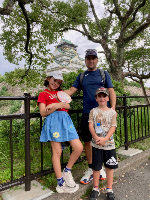 From there we headed to Osaka Castle and its grounds, which we accessed by crossing a bridge over a huge moat. The colossal stones in the castle’s walls were impressive and the castle was beautiful, complete with golden tigers on the upper parts of the façade and pure white walls with green roofs. We stopped to watch a goofy Winnipegian busker, got the kids some overly sweet sno-cones to beat the heat, met a very friendly Korean family who wanted to take pictures with the kids, and headed home via Ogimachi Children’s Park where Kieran tried out his new Beyblade and where we couldn’t help but smile as three adult women gleefully raced each other down the slides.