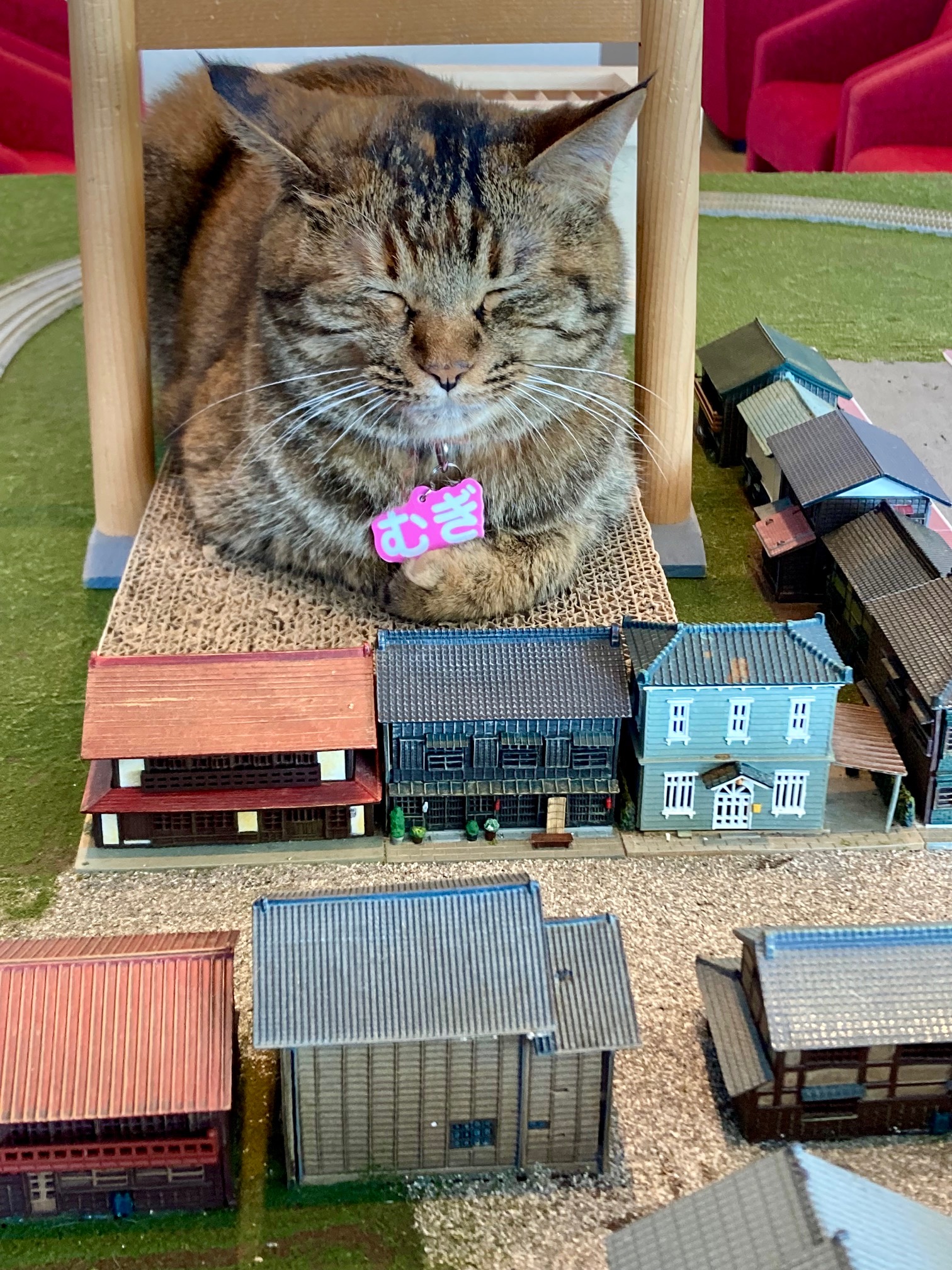 Our next day in Osaka as an exciting one, as we had reserved a morning spot at an interesting-looking cat cafe. The pinned reel at the top of Cats Wonderland’s Instagram profile shows adorable cats peering around and batting at a huge model train set that runs the length of the harbourfront space, so expectations were high. Here to tell you, it did not disappoint. The cats were lovely – we’ve noticed a lot of the cats here have striking blue eyes – and Kieran made a new friend with the kindly older gentleman running the café (they bonded over their shared passion of trying to get as many train cars as possible chugging down the track).