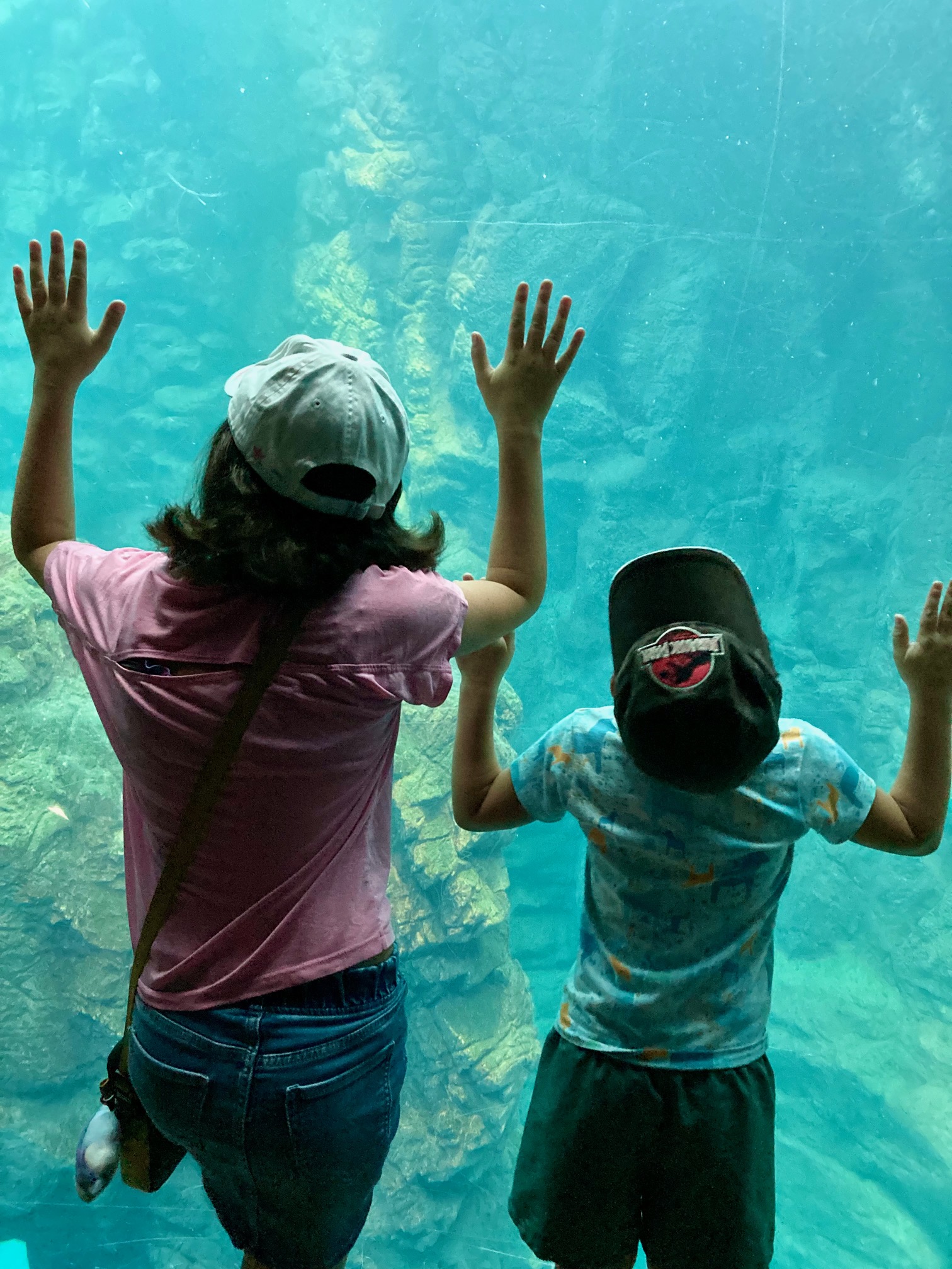 After finishing up with the cats, we walked a block or two along the harbor which has a lovely view dominated by the huge and colourful Tempozan ferris wheel. After soup dumplings, okonomiyaki, and takoyaki (plus chicken Nuggets for Kieran) in the food court, we headed to the Osaka Aquarium. I wasn’t super excited for the aquarium; the day was sticky hot, and I was wilting. We’d also been to a lot of zoos and aquariums by that point in the trip! And, my shoes were a half size too small so I was feeling like The Grinch (“it could be, perhaps his shoes were too tight”). Nevertheless… I persisted (ha).