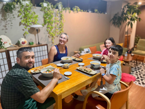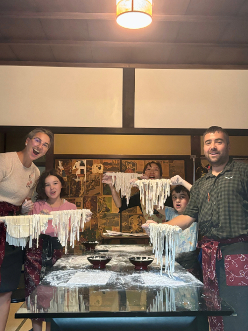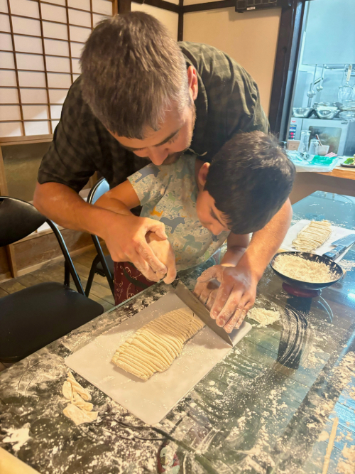 We had two back-to-back days of culinary instruction in Kyoto – udon with Tanaka and ramen and gyoza with Yukari. I’ll start with our udon-making experience… it was so much fun! It was in the Kyoto Izumo kyo-machiya (traditional old town house / inn) with cool wooden accents. The tatami sitting room on the main floor had little covered patios out the front and back for ‘season gazing’ (looking out at the lovely bamboo and moss garden during different times of year). We headed into the kitchen area and Tanaka first taught us about the different types of udon before we started to make our own dough of all-purpose flour (medium gluten content!), coarse sea salt and room temperature water. What followed was lots of kneading, ‘udon dancing’ (placing the dough in a plastic bag and flattening it out with our feet – as you can imagine, the kids loved this part), folding, and rolling before cutting into strips and boiling for fifteen minutes. As it cooked, we got to explore the upper floor of the lovely building, and then the resulting noodles were served to us in the formal dining room with chilled broth and tempura vegetables. It was very delicious, and all the more so for having made it ourselves. Perhaps we are overconfident, but we now want to host an udon-making dinner party once we’re back at home. We capped off the day by perusing the pretty, traditional Japanese sweets from the tiny confectionary around the corner from our apartment and selecting a bunch to take home and try.