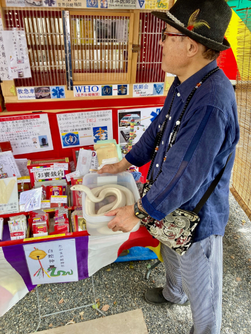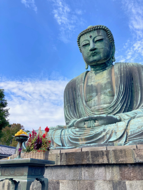 The caves were formed by waves cutting deep into the rock and are now accessible because earthquake movement lifted the rock bed up above sea level. The entrance was filled with flickering votives placed on the rocks and reflected in a small stream; it was so beautiful. We each received a small candle in a holder to explore the first cave, which is over 150 m long. The narrow and low passage was lined with rock sculptures of Buddha, Kannon, Naga, and others. It is said that the first ‘finger’ of cave one leads to the base of Mt. Fuji via linked underground tunnels, and the second ‘finger’ is the original shrine of Enoshima, from the year 552 (!). The second cave, just around the coast from the first, was hung with votives hanging from the ceiling (very moody) and had a sculpture of a dragon at the end (a five-headed dragon falling in love with an Enoshima maiden is one of the main legends of the island). We exited the caves to admire the stunning views over the rocks and out to sea. Then it was back along the red bridge and up, up, up to ring the Dragon Love Bell (for immortal love) and alllllll the way back down all the stairs to our bikes. That is when Grace realized she’d left her beloved silk fan at the restaurant, so she and Sean headed back up while Kieran and I said hello to an adorable Shiba Inu and its owner.