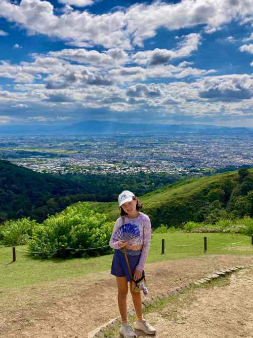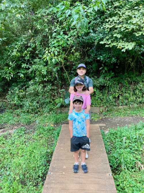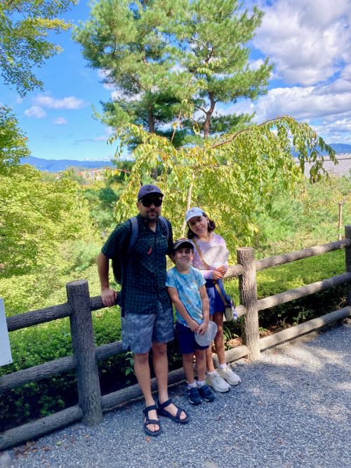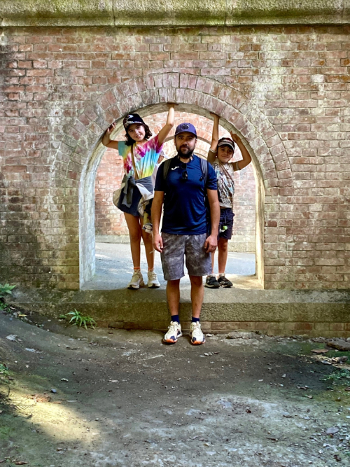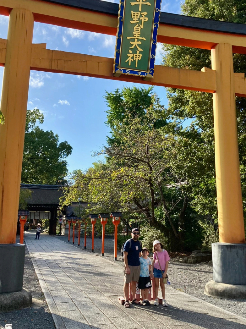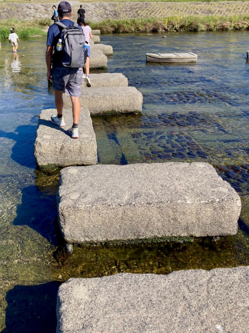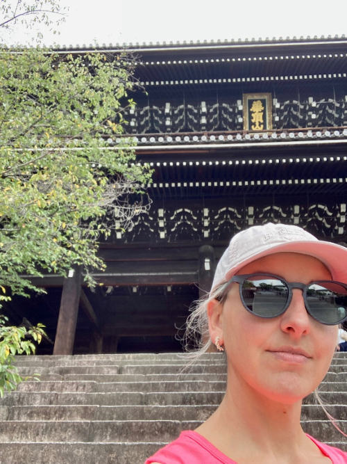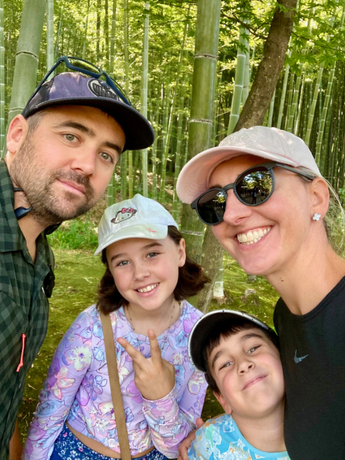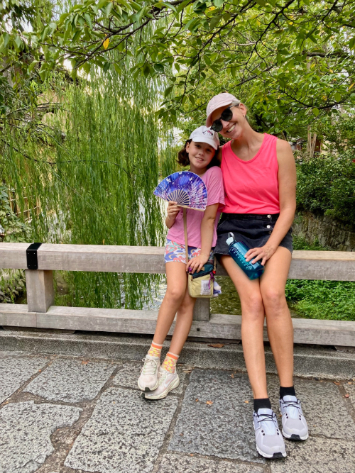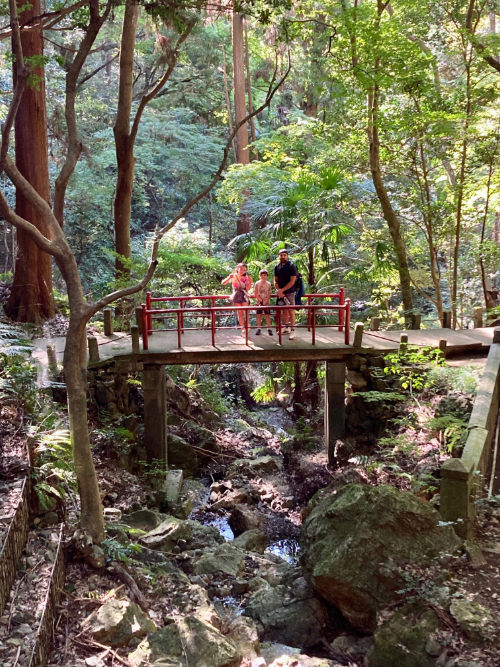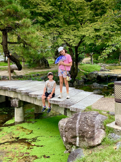 We ended week three with (a School Bus Coffee start and) a hike. We bussed north and walked up the cute little cobbled Ginkakujicho Street full of souvenir stands, sweets shops, cafés and craft stalls before turning left from the crowds to start the trek up Mount Daimonji. It was so nice to be back amongst leaves and trees and nature! The trail had a super steep first third (some of the sheerest parts with stairs) with a rewarding 180 view from the top of Kyoto and its surrounding lush green hills – very beautiful. Due to the incline, we were surprised to see a class of tiny children (maybe 4- and 5-year-olds?) up there. We enjoyed a picnic lunch and School Bus almond croissants at the top (food on hikes always taste 170% better, fact). Starting our way down, a very kind gentleman urgently warned us not to get lost even though we had a GPS map downloaded and an extra charger, and he even backtracked his route a bit to see us successfully on our way. We wanted to somehow let him know we’d made it out safely later that evening; he’d seemed so concerned! The second half of the hike brought us past a tiny pond with a big school of bright orange fish circling around in it, and huge spider webs overhead hosting big, spindly, yellow and black spiders. Not Grace’s favourite feature of the day. We skirted a peaceful, sun-drenched cemetery, saw a warning sign for an aggressive family of local monkeys, spied shrines way up in the rocky sides of cliffs, and came by a tiny pinpoint of a waterfall that was set up for ritual bathing. Our path ended at Nanzen-ji Temple which has a very Romanesque-looking arched aqueduct, very strange-seeming given the surrounding architecture! After a drink stop, and much to the kids’ disappointment, we walked the 50 minutes home via a zoo (which we smelled before we saw it) and along a canal in the waning heat of the day.