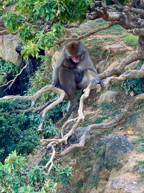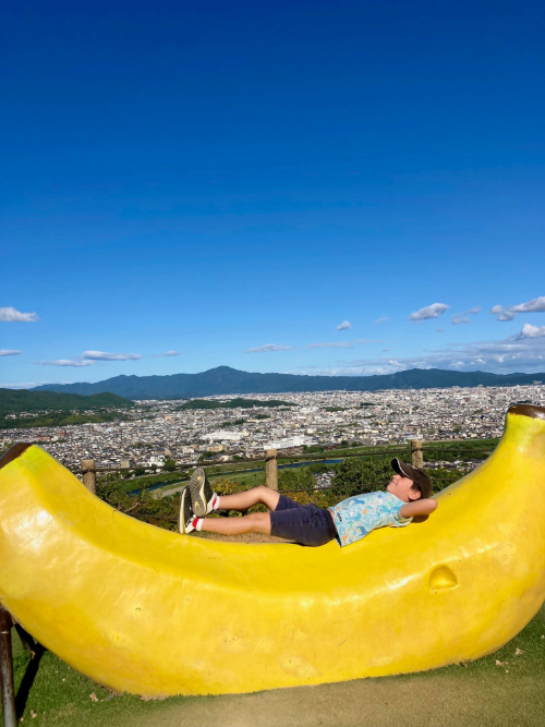 After the bamboo grove, we walked to the Katsura River – and it was like stepping into a Seurat painting; couples in little blue punter boats, families strolling along the small riverside promenade, pure white ibises standing stock-still on the weir, all against the lush green mountain backdrop. We crossed over the Togetsukyo Wooden Bridge to the Monkey Park and started the steep hike up to see the wild macaques. There was a little mama and baby pair who stole my heart – mama picking through baby’s fur to look for bugs while baby slumbered in the sun, baby clinging to mama’s chest while they both dozed in the shade; I couldn’t stop taking their picture. The kids, meanwhile, wanted their photos taken on a giant banana at the top of the hill in front of the sweeping city views. It was a cool experience.