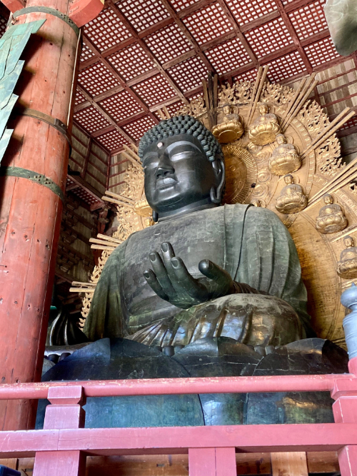 Todai-ji was one of my favourite parts of the day. It was first built in 752 as the head Buddhist temple of all the provincial temples (Nara was the original capital of Japan). The main hall is all wood, with soaring dark ceilings held up by huge red pillars. It houses the Big Buddha, one of Japan’s largest bronze statues at 15 metres tall. There were also other Buddhas and statues in the hall, including two large and beautiful bronze vases holding twisting bronze lotus flowers growing up into the air. And of course, there is a pillar towards the back of the hall which has a small hole through the base of it, said to be the same size as the Big Buddha’s nostril. Legend has it that if you squeeze through, you will have good luck… so of course the kids and I had to try. I fit through the last time I visited by turning on a diagonal to get my shoulders through, and the technique worked again, though the video footage Sean took is less than graceful.