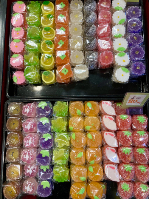 - Treats: matcha ice cream, delicate jellies shaped like fruits, tiny flower-shaped hard candies, mochi, strawberry jellies, chestnut cakes…