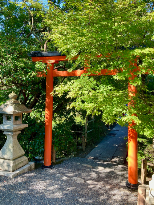 From there, we walked past the very cool Fine Arts Museum to Ryoan-ji. The rock garden there is said to be one of the best remaining examples of kare-sansui (“dry landscape”) so I wanted to see it, but I was blown away by the rest of the grounds as well. Upon entering, we encountered a small lake surrounded by bamboo and completely covered with lily pads. We ambled along the groomed stone path until we came to a small stone bridge that took us under a bright red torii gate to a tiny island in the lake. After that, we headed up toward the old wooden hojo (head priest’s residence) which serves as the entrance to the garden, and the lovely wood was so smooth and worn underfoot that it felt soft. The garden is made of fifteen large rocks in small groups, nestled in little islands of moss and surrounded by small, round white river stones raked into swirls and lines. The patterns are meant to facilitate meditation and indeed, there was a sense of serenity in that place that I can’t describe. There were also incredible ink-on-paper wall drawings of large dragons amongst clouds in the hojo’s surrounding tatami rooms, each opening out to a different garden space of moss-covered roots, ferns, bamboo, and small maples with their leaves just starting to turn red at the tips for fall.