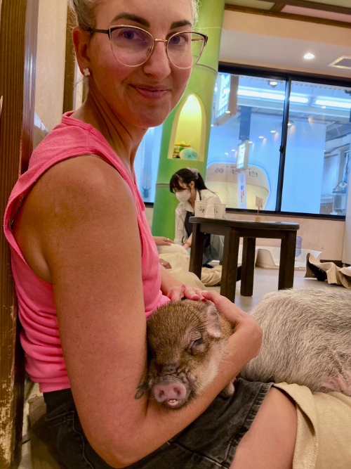 Oh, the cuteness! We were escorted to one of the rooms where we were greeted by a set of pink piggie triplets, two bigger brother pigs, three tiny brown ones with chestnut stripes each only five months old, and a funny black pig name Bogo that liked to rest his chin on your foot and chew the air so you could feel his little gullet moving on your toes. The piggies were super cuddly and liked to come and snuggle right on our laps, with some even falling asleep there. They also liked to pile up on one another, and my personal pig-in-lap count was six at one point. We extended our time by another half hour but sadly, eventually had to leave our new friends. We headed to Takashimaya department store to ogle the coloured glassware, pounded metalware, and beautiful homewares, and to buy some pretty postcards. We stopped and ate soup dumplings next to a little stream near the main market street, and walked home to meet Sean – who was in high spirits, having met a very friendly couple who kept buying him beers!