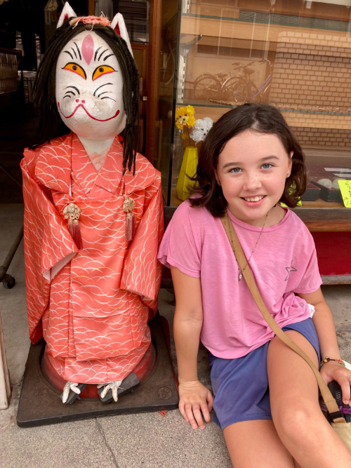 We have been loving Kyoto! In our second week here, we spent a day wandering the Gion district, starting with a VERY smooth and excellent coffee from Kurasu Kyoto. Sipping away, we walked along the Takase River and then up through Kennin-ji temple grounds towards our first stop, Vintage Kimono AN Gion. There, we browsed through racks and racks of the most beautiful silk kimonos, cotton yukatas, and brocaded obis, and each kid chose a kimono to bring home as a very special souvenir. They cannot wait until we partake in a tea ceremony so they can wear them! After all the shopping, we needed sustenance, so we popped into Mantsune for ‘washoku’ (Japanese cuisine). It turned out to be the best shrimp tempura any of us have had, served by the friendliest staff member who led us outside after lunch and showed us a wooden fish sculpture on the outside of the building that she said was from the Edo period.