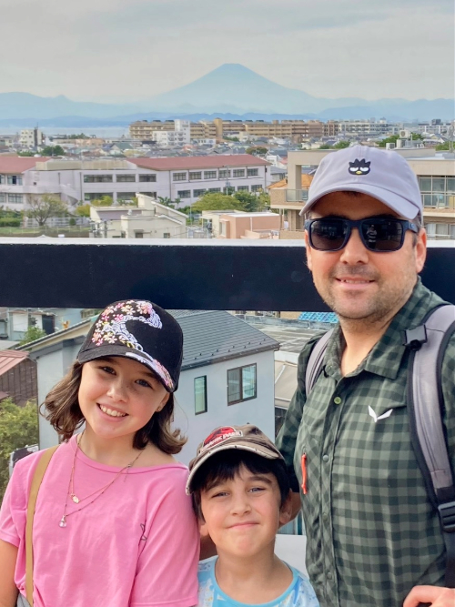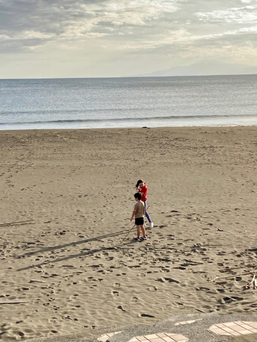 Tuesday dawned with me going for a morning jog along the beach; it was so peaceful watching the surfers bobbing around waiting for a good wave. When we were all fed and dressed, we hopped onto our bikes as per usual and headed up to Kamakura. The beachfront road along Shichirigahama Beach was so pretty to ride along! We stopped at Windera Café for a pick-me-up coffee, enjoyed from their second-floor view out over Sagami Bay. In Kamakura, we headed to the Kotoku-in Temple to see its Great Buddha statue (alas, not quite as big as the one in Nara) and paid a small fee to go inside of it (!). We escaped the busy little main street and headed back to the beach for a picnic lunch in the shade of some fishing boats, next to the boats’ owners enjoying their own meals (and keeping an eye out for the huge black kite birds that will come and steal your lunch if you turn your attention elsewhere). It was then off to Cape Inamuragasaki to play in its magical jet-black sand that shimmers gold as the waves recede over it, before cycling through the crowds that gather at the famous Enoshima Electric Railway crossing which has been immortalized in many Japanese movies, shows, and manga series. Our friendly Airbnb host, Kiwa, came over to say hello in the evening and Sean threw a delicious dinner together from seemingly nothing.