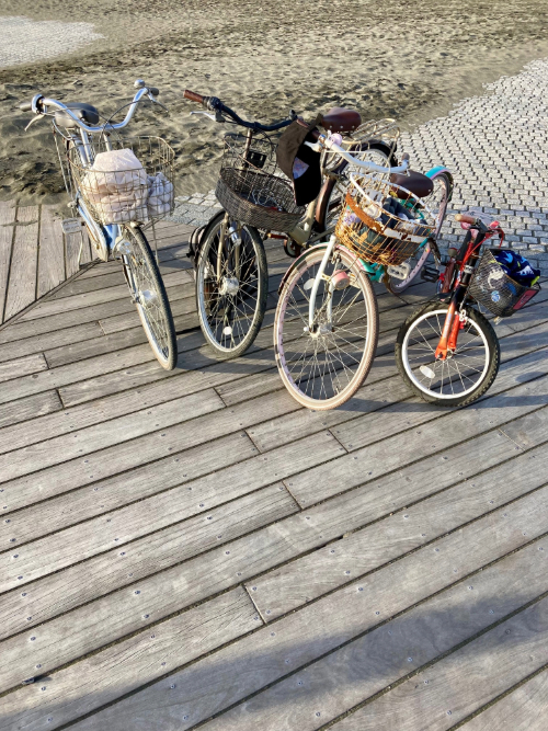 Bikes safely recovered, the next day we pedalled for coffee at The C (and amused ourselves with their mini jigsaw puzzles and mindbender games), stopped at a grocery store for picnic lunch supplies, and rode all along the beachfront promenade to Chigasaki Southern Beach’s “Big C”. I don’t ride a lot at home (the kids were surprised to see that I knew how to bike, ahem) and I always forget about the sheer unbridled joy of the wind-in-your-hair, sun-on-your-face freedom while riding. At the turnaround, we rested in the sun, and the kids played with huge bamboo sticks on the beach. Of course, Kieran got his feet wet in the surf and was upset when he had to ride home with damp, sandy shoes. On the way home, Grace’s super rusty chain fell off and jammed in between the gear and the cover, and I felt VERY accomplished that Sean and I got it back on with the help of a disposable chopstick. We finished off our day tired but replenished by Sean’s tasty homemade okonomiyaki dinner.