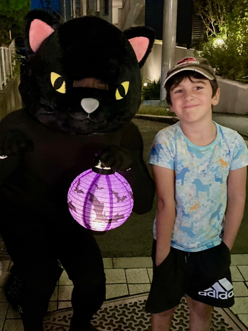 The Ofuna Botanical Garden has over 3000 taxa of flowers, 370 of which are unique rose varieties. I had read that November is prime rose-viewing season, and the blooms did not disappoint. But before we got to the ‘rosery’, we started off our visit with a little trick or treating for the kids at the information station (an added bonus, as we had told them there likely wouldn’t be any Halloween this year) and photos at cute pumpkin / witch / ghost stations. We strolled along a lovely pond ringed with pretty cosmos, and down paths winding through leafy trees. We ogled gorgeous bonsai and huge Japanese chrysanthemums which were being judged in a competition. I took over a hundred photos of roses – I abstained from posting them all on Instagram; you’re welcome. We also loved the green house full of hibiscus, palms, mounted staghorn ferns, orchids, lilies and Venus fly traps (which I’d never seen live before). Then we walked back to the monorail station in the dying light, with dusk over the river making the Kannon up on the hill look so pretty. Back on Subana-dori main street, we enjoyed some incredible fried yam chips from a street vendor and wound our way through many tiny trick or treaters. The mainly-pedestrian street was packed and all the businesses up and down were handing out candy and snacks, so the kids got to trick or treat after all.